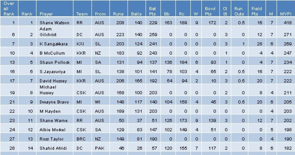 The table below indicates that Shane Watson currently tops the list, with Adam Gilchrist at the second place. Michael Hussey and Matthew Hayden are still in the top 10 although they played just four matches.