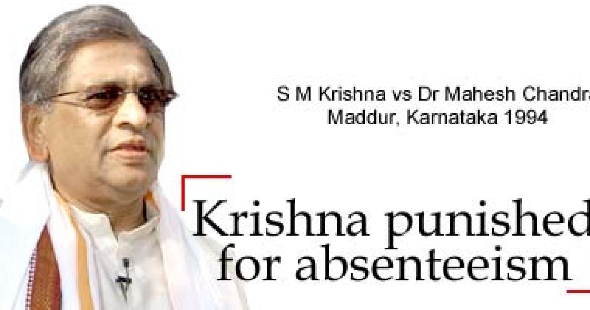 Krishna was drubbed in 1967 in Maddur by Manche Gowda. In 1994, it was Gowda's son, Dr Mahesh Chandra contesting on a Janata Dal ticket, who defeated Krishna.
