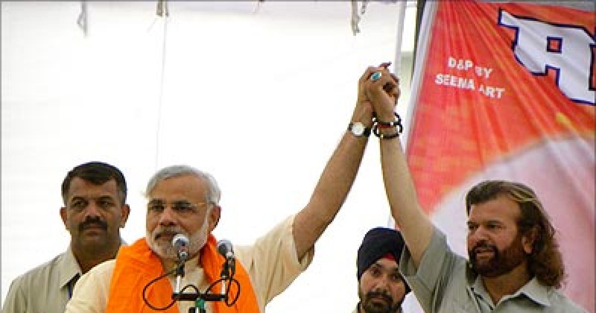 Image: Gujarat Chief Minister Narendra Modi with Hans Raj Hans at a campaign rally. Photograph: Satish Bodas