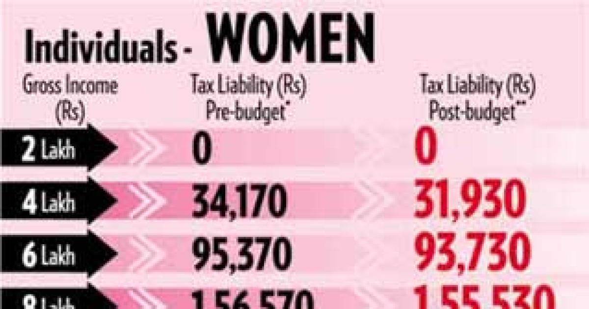 This Budget's impact would be most felt by tax assessees who are women, senior citizens or those who have a gross income of about Rs 5 lakh. Illustratively, someone with a taxable income of Rs 3.85 lakh would now pay tax of Rs 35,535, a reduction of about 5.85 per cent in taxes.