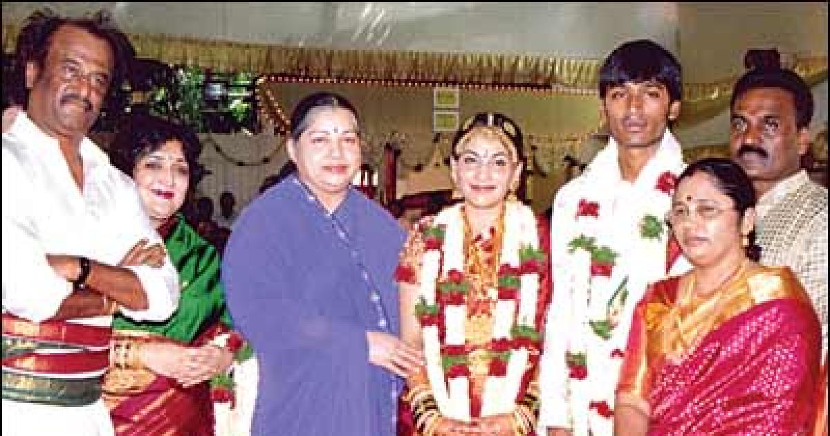 In the picture: Rajnikant, wife Lata, Tamil Nadu Chief Minister Jayalalithaa, Aishwarya, Dhanush and the groom's parents, Kasthuriraja and Vijaylakshmi.