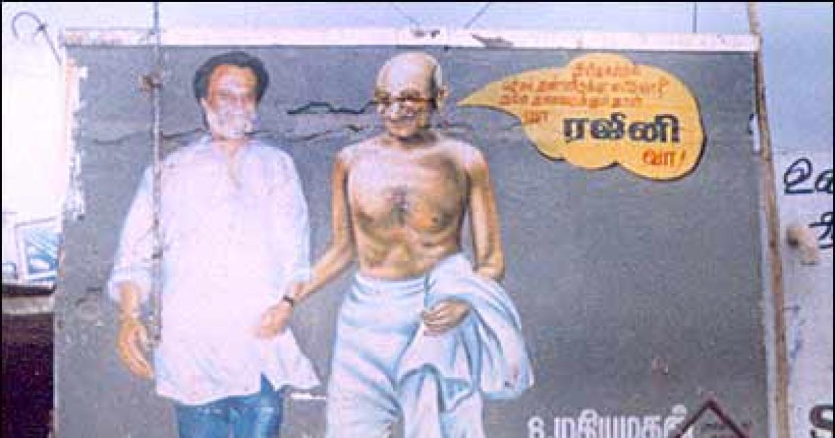 The painting cost Rs 2,500, a sum invested by members of the local Rajnikanth fan club. The fans say there is too much corruption in politics today, and Rajni is the only honest man around! And the only other honest politician they can all agree on is the Mahatma. So they simply decided to put the two together!