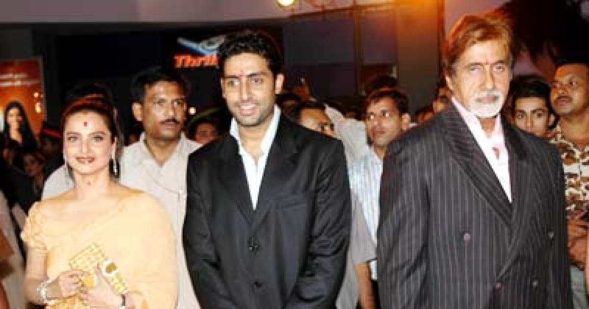 Rekha (left, above) posed smilingly with Amitabh and Abhishek Bachchan, as did her Cannes-rocking Bachke Rehna Re Baba co-star, Mallika Sherawat. (left, below)