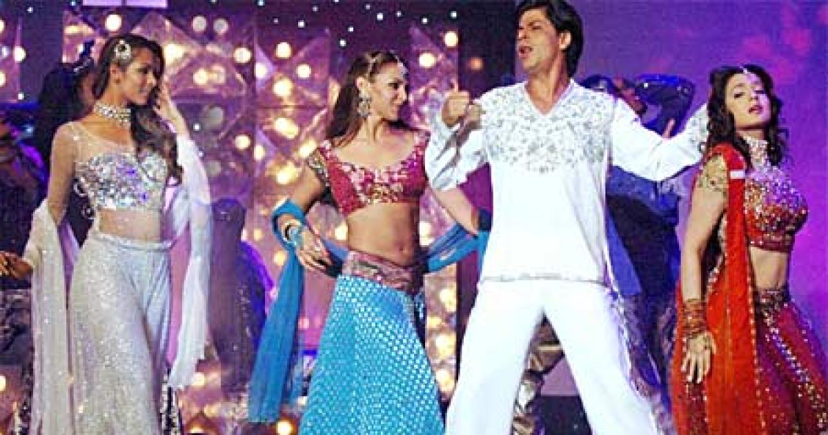 Accompanied by Malaika Arora (far left), Esha Deol (centre), and Amisha Patel (right), Badshah Khan rocked a Mumbai audience on Sunday for the launch of Videocon's LCD and Plasma TV range.