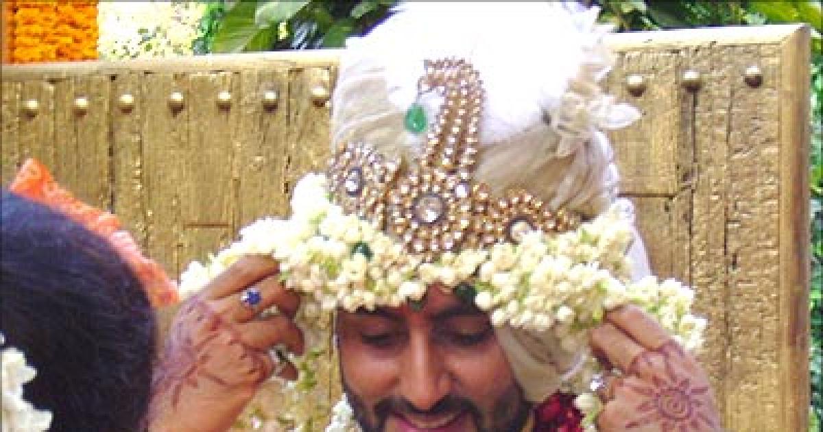 Abhishek Bachchan, wearing a beautiful jewel-studded sehera, enters Prateeksha, where his bride--to-be awaits.