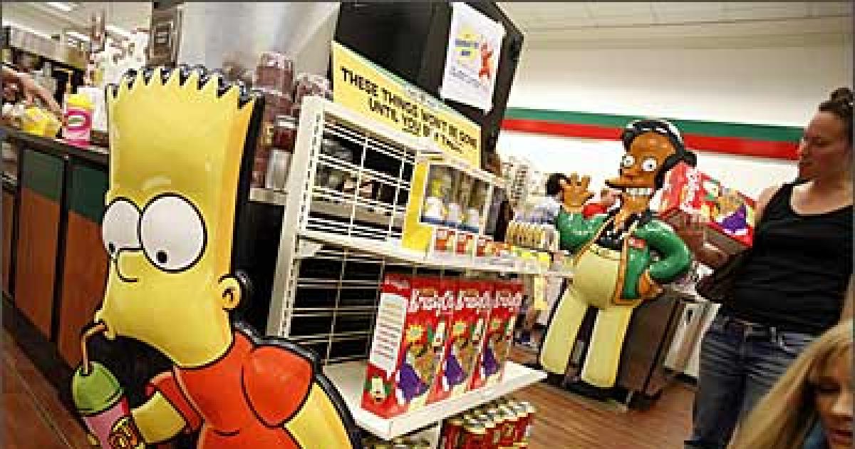 According to The Simpsons, whose Kwik-E-Mart is an intense parody of the franchise, they all feature unhealthy snack foods and usually an Asian immigrant manager, Apu Nahasapeemapetilon in.