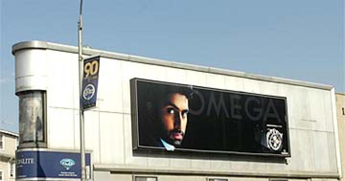 On one side of the building there is a picture of Guru-star Abhishek Bachchan, endorsing Omega watches.