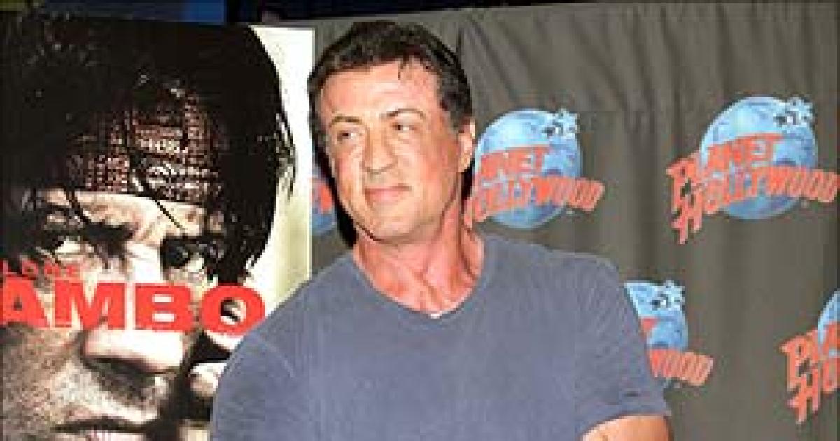 Here, Stallone is at Planet Hollywood in Times Square, New York City, donating Rambo memorabilia to the restaurant franchise.