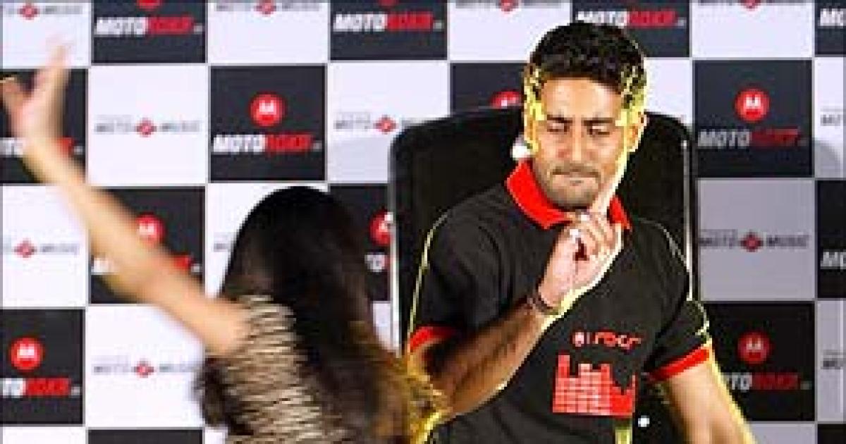 Abhishek Bachchan, who is the brand ambassador for mobile phone company, Motorola, broke into an impromptu jig with a fan during the launch of the new Motorockr E8 phone in Mumbai on June 17.