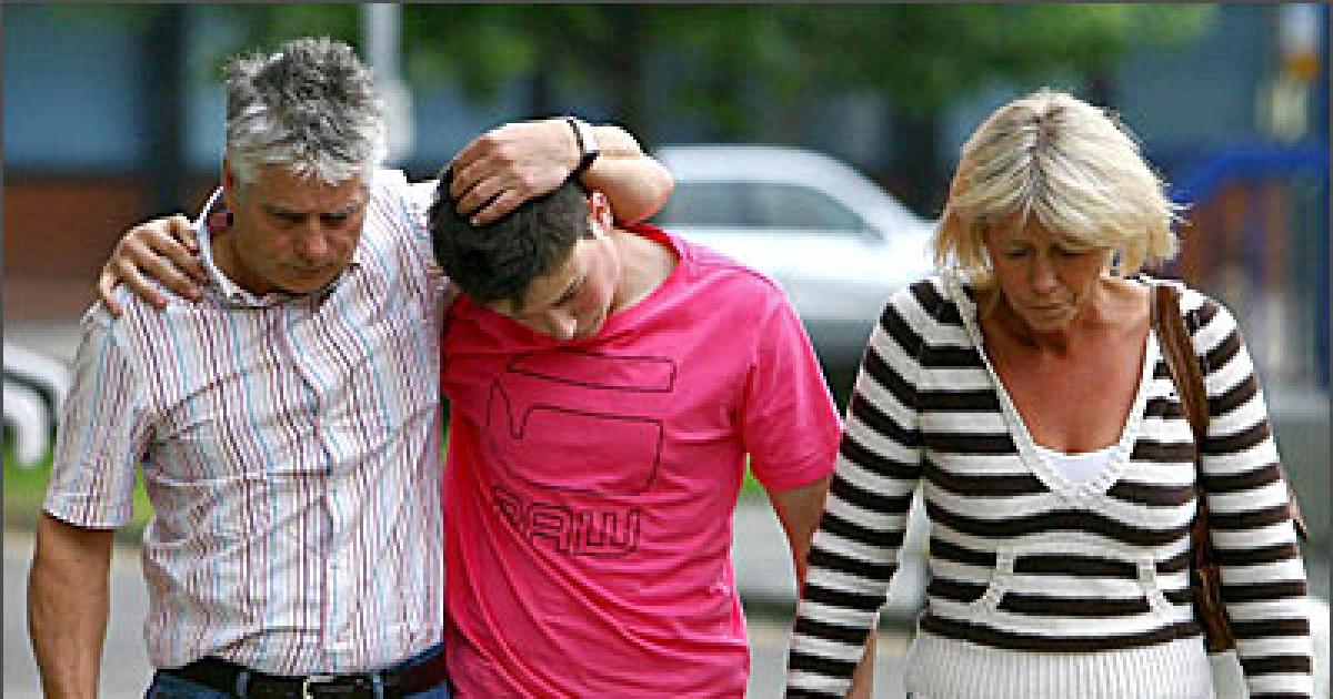 In the picture: Colin, Jamie and Sally Knox, respectively father, brother and mother of the 18-year-old actor walk after a press conference on Sunday in Sidcup, Kent.
