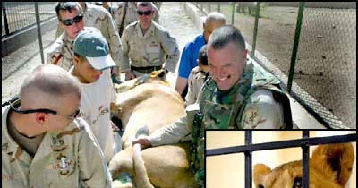 US army sergeants transport one of Uday Hussein's lions from his palaces inside the Green Zone to the Baghdad zoo.