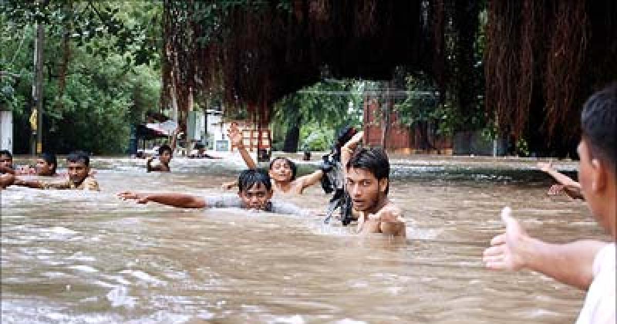 Villagers form a human chain to help people cross a swollen river in Kalali, some 20 kms from Vadodara on Wednesday.