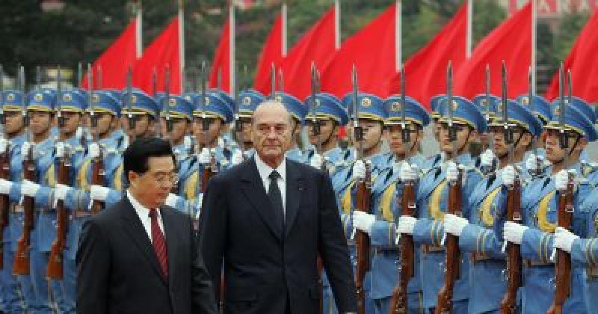 French President Jacques Chirac, with his Chinese counterpart Hu Jintao (left), inspects a guard-of-honour outside the Great Hall of the People in Beijing.