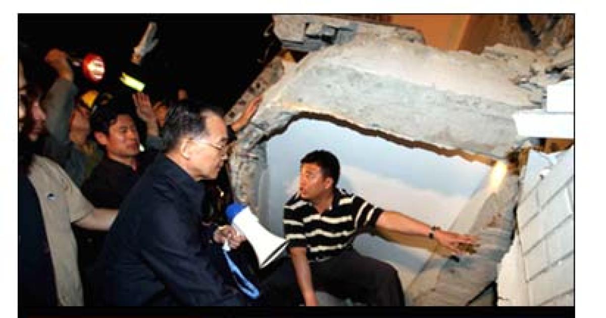Chinese Premier Wen Jiabao speaks to a rescue worker looking for bodies under a collapsed hospital in Dujiangyan, in south-west China's Sichuan province on Tuesday after an earthquake measuring 7.8 rocked the province.