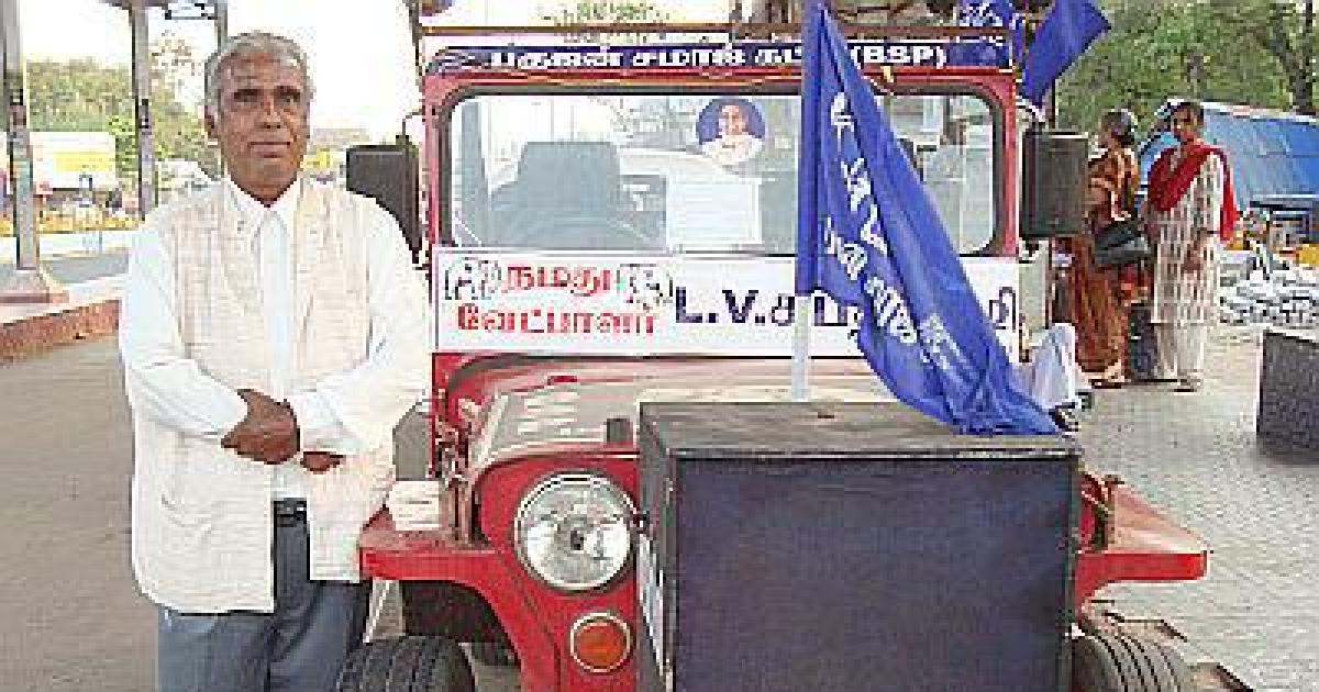 Caption: L V Saptharishi about to set off on his election rally from Darasuram bus-stand in Kumbakonam, Mayiladuthurai Lok Sabha constituency.