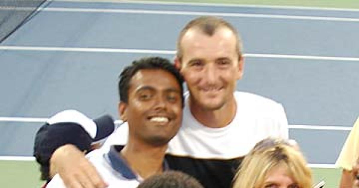 Reader K D Babji, who sent us this photograph, wrote: 'Here is my photo with Martin Damm at the US Open 2006 men's doubles final, after Martin and Leander Paes won it.
