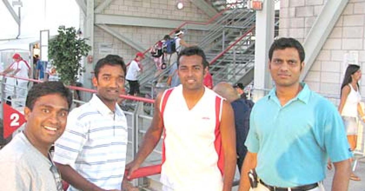 'This is Vijaya (white T-shirt) along with my friends Sudhir and Venu. We caught up with Leander Paes during the Rogers Cup in Montreal, Canada. He is so different; not so aggressive as one observes during matches. He let us take videos and pictures,' writes Vijaya.