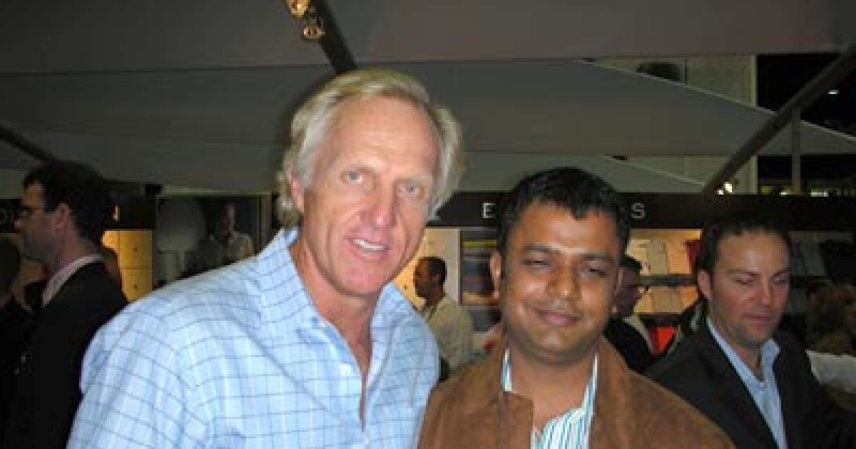 'I met Greg Norman at the recently-concluded PGA show at Orlando, USA. We handle Norman's India office here. Hence this chance of meeting. He is really a cool guy and carries an enigma around him. My eyes got shut with flash. Apologies for same,' writes Anshu.