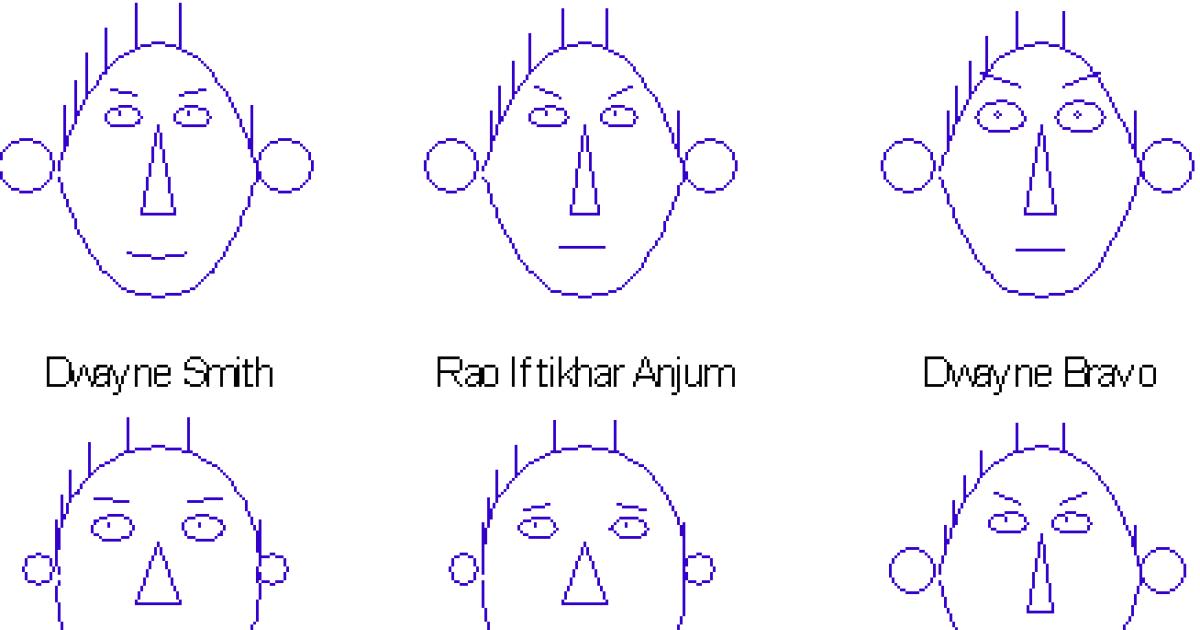 The batsmen (Malik, Samuels) have round faces, eyes wide apart, smaller ears and a wider nose. The more runs they score, the more they seem to smile.