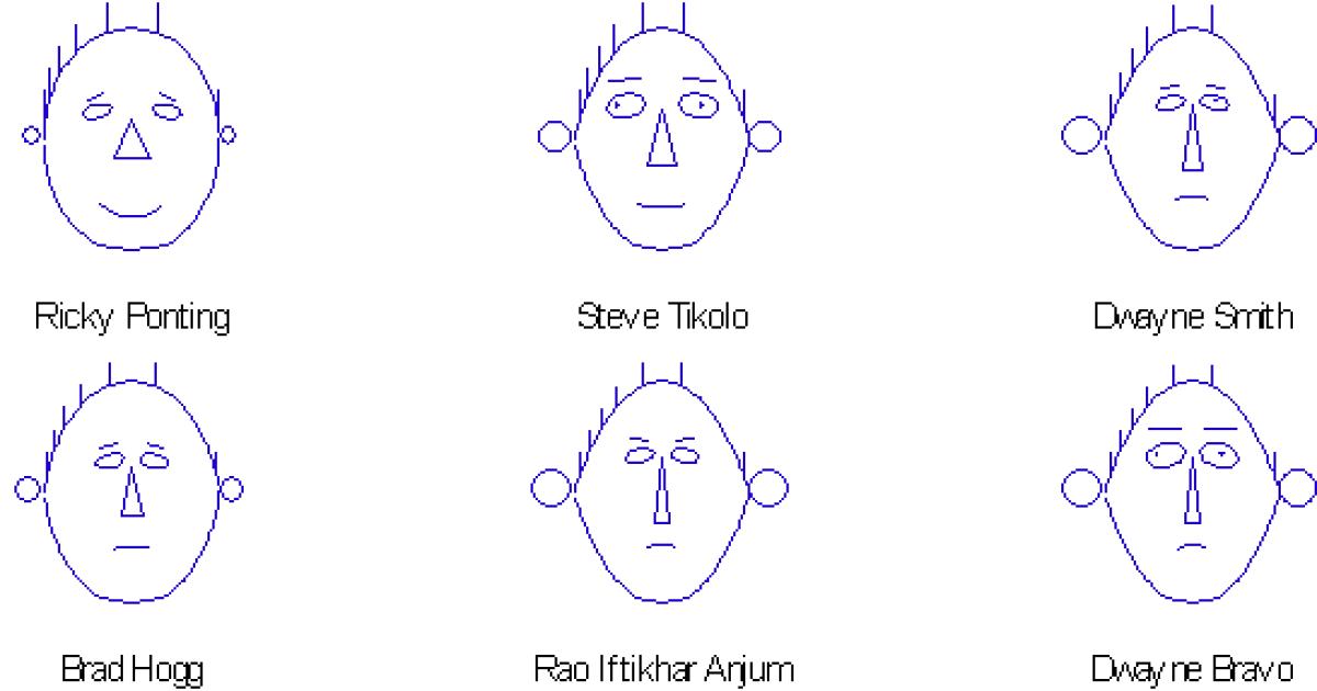 The Chernoff faces of the top nine players are shown below. Recall that the highest ranked player has the longest hair; the batsmen have round faces, eyes wide apart, smaller ears and a wider nose. The more they score, the more they seem to smile (see "Ponting"). The bowlers are quite the opposite: tapered faces, eyes close to each other, bigger ears and a longer nose (see "McGrath").
