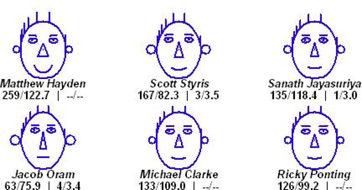 The more the batsmen smile, the more runs they have scored (see "Hayden"'s wide smile).